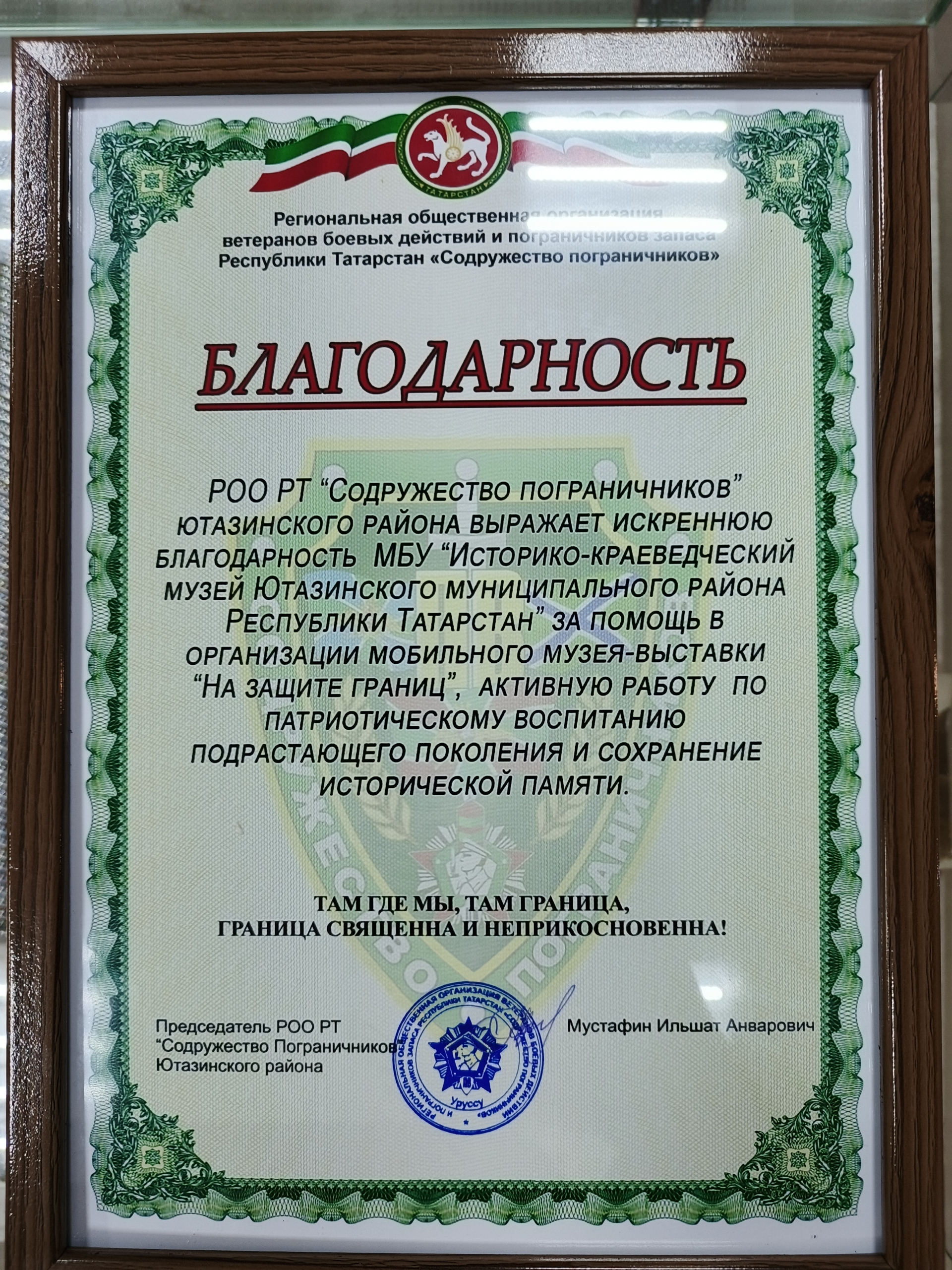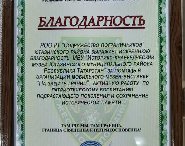 Сотрудники Историко-краеведческого музея выражают глубокую признательность председателю Региональной общественной организации Республики Татарстан «Содружество Пограничников» Ютазинского района Мустафину Ильшату Анваровичу и его коллегам за проведенное мероприятие и активное участие в патриотическом воспитании подрастающего поколения и жителей района.