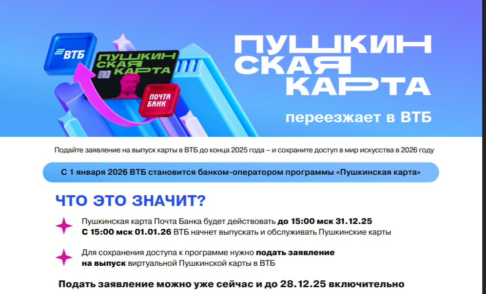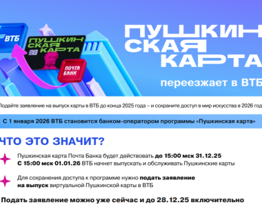 ПУШКИНСКАЯ КАРТА переезжает в ВТБ: что нужно знать о смене банка-оператора