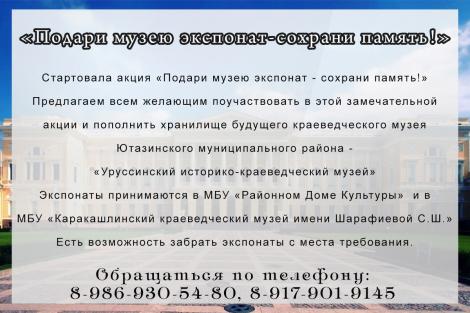Предлагаем всем желающим поучаствовать в этой замечательной акции и пополнить хранилище будущего краеведческого музея Ютазинского муниципального района – «Уруссинский историко-краеведческий музей».