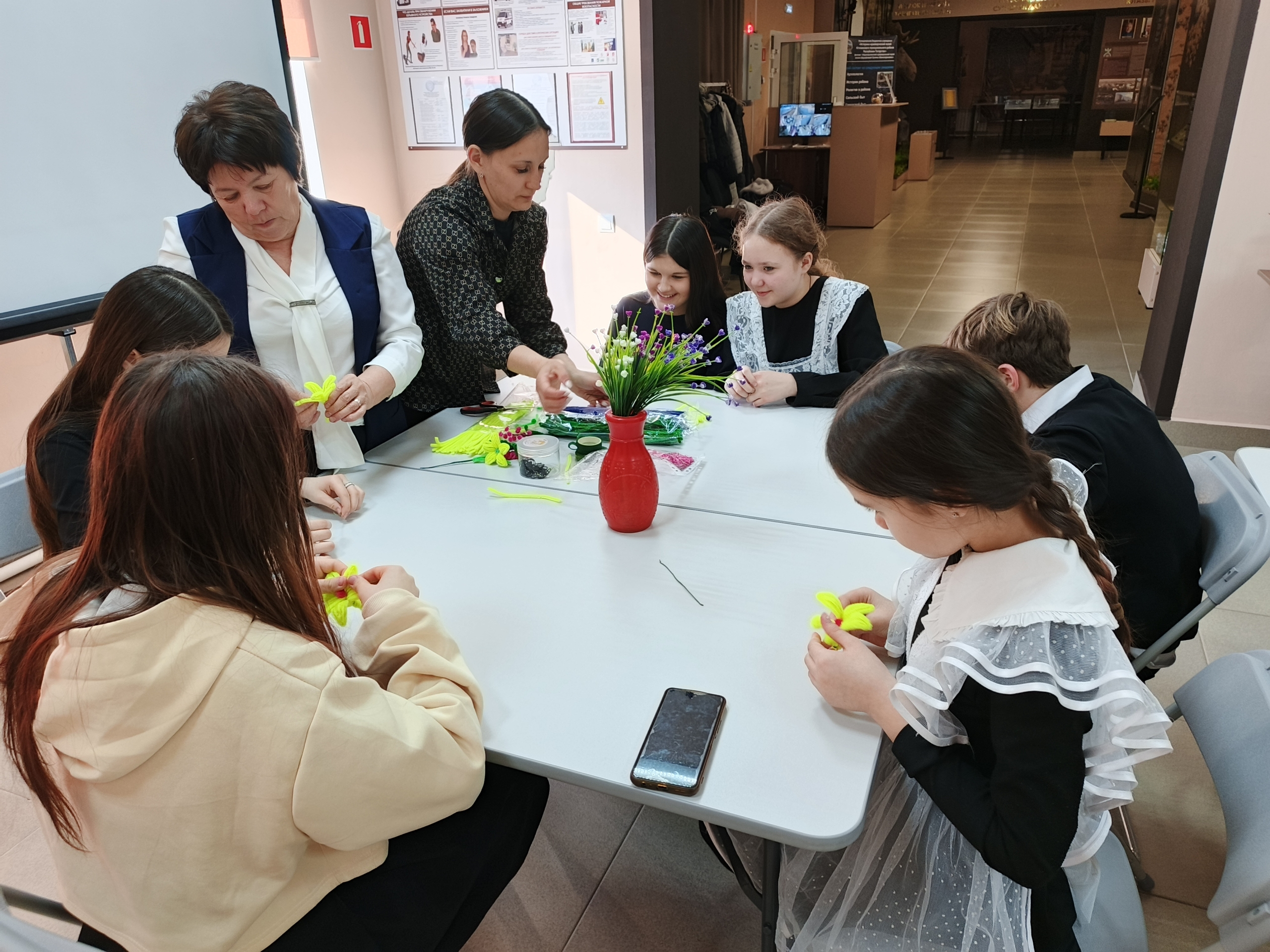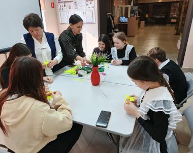 После экскурсии для ребят провели мастер-класс «Весеннее настроение». Там они научились делать цветы из синельной проволоки.