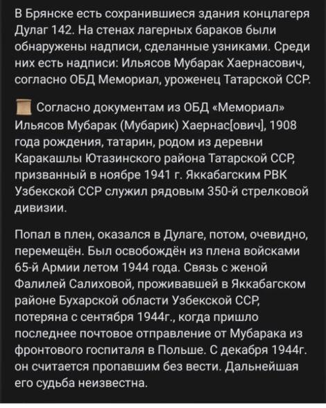 ВНИМАНИЕ ! ВНИМАНИЕ ! ВНИМАНИЕ ! ОЧЕНЬ ВАЖНО ! ВАЖНО ДЛЯ РОДСТВЕННИКОВ В ДЕРЕВНЕ КАРАКАШЛЫ !!! В Брянске есть сохранившиеся здания концлагера Дулаг 142, На стенах лагерных бараков были обнаружены надписи, сделанные узниками. Среди них есть надписи Ильясов Мубарак Хаернасович. Согласно ОБД мемориал ,уроженец Татарской ССР , согласно докумнтам из ОБД "мемориал" Ильясов Мубарак(Мубарик) Хаернас(ович), 1908 года рождения , татарин, родом из деревни Каракашлы , Ютазинского района Татарской ССР, призванный в ноябре 1941 года, Яккабагским РВК , Узбекской ССР служил рядовым 350-й стрелковой дивизии. Попал в плен , оказался в Дулаге, потом , очевидно перемещен.Был освобожден из плена войсками 65 -й Армии летом 1944 года. Связь с женой Фалилей Салиховой ,проживавший в Яккабагском районе Бухарской области Узбекской ССР, потеряна с сентября 1944г, когда пришло последнее почтовое отправление от Мубарака из фронтового госпиталя в Польше.С декабря 1944 года считается пропавшим без вести. Дальнейшая судьба неизвестна.