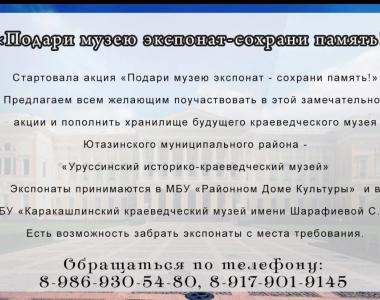 © 2022 МБУ «Историко-краеведческий музей Ютазинского муниципального района». Все права защищены. Обращаем ваше внимание, что информация размещенная на сайте, носит исключительно информационный характер и ни при каких условиях не является публичной офертой, определяемой положениями статьи 437 (2) Гражданского кодекса РФ. Оставляет за собой право в одностороннем порядке в любое время без уведомления вносить изменения, удалять, корректировать или иным способом менять информацию о ценах и услугах на сайте. Данный веб-сайт использует файлы “cookie” для того, чтобы сохранить ваши данные на вашем компьютере. Узнать подробнее.